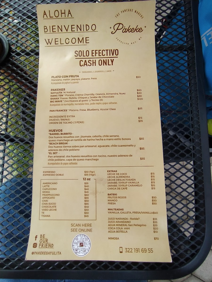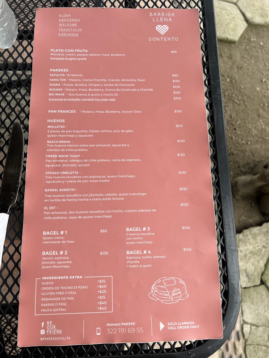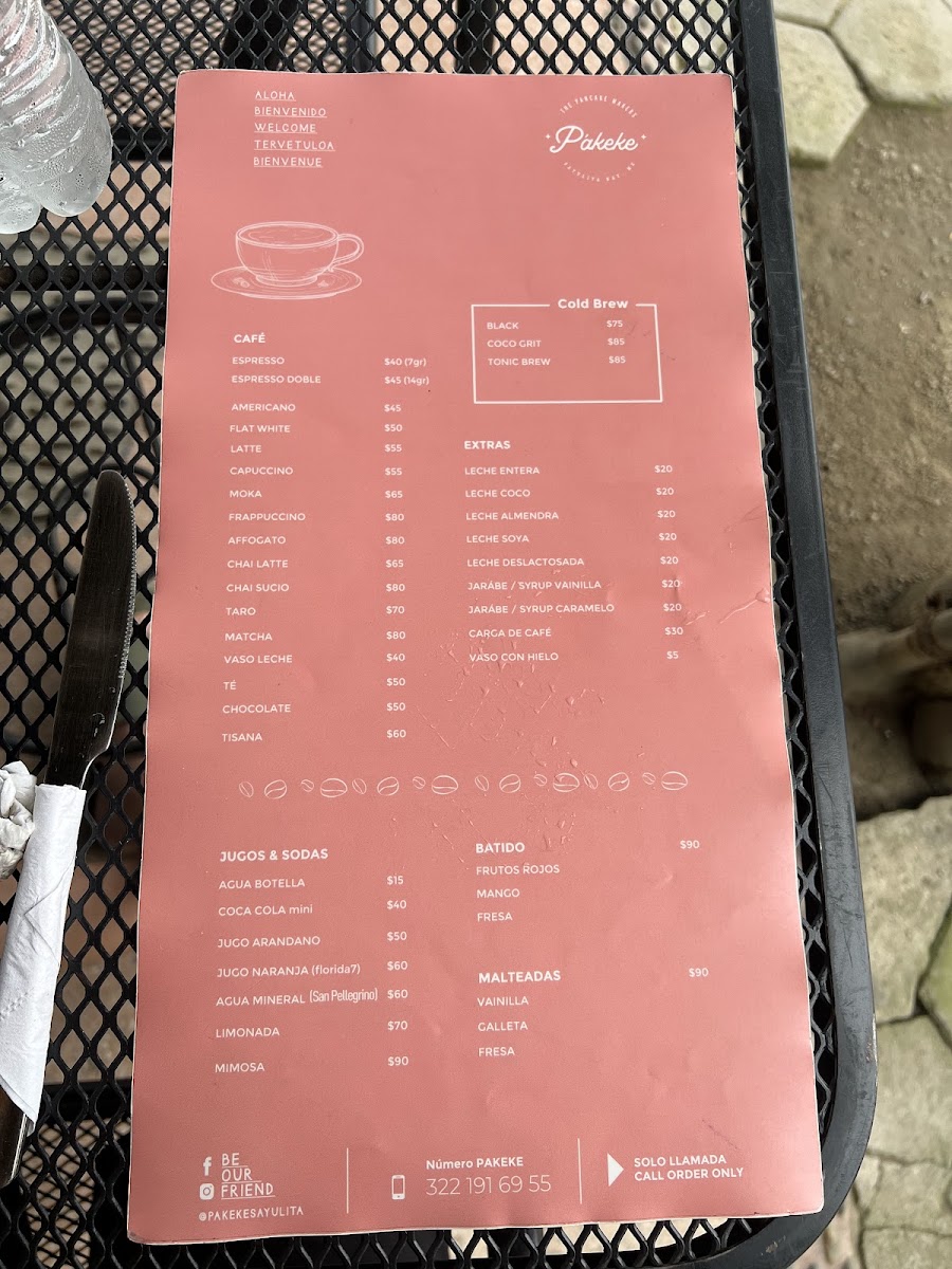 “ We did a snorkeling tour while on vacation and the shuttle picks you up at Pakeke. We grabbed lattes prior to heading out and realized that this was the first place in Sayulita that made the kind of latte we are used to having in our hometown. Their foam presentation even in a to go plastic cup was so neat. We decided to go back the next day for breakfast and are so glad that was the last meal we had in Sayulita before leaving for home. We got the molletes with an egg, burrito, spinach omelette with gluten free bread and we had to try one of the Pakeke’s. Everything was so good and fresh tasting. The food came out hot. The Pakeke we choose was thinner not quite thin as a crepe but it was so good it didn’t even need syrup. The molletes was delicious. I never thought about refried beans on a piece of toast with an egg but I am definitely going to make this at home. This place really does and outstanding job at presentation and taste. Also my daughter who is celiac said it was some of the best gluten free bread she has ever had. Quite a gem of a place. For 4 people, with drinks and food we paid about 1000 pesos. We also got a to go order as well so really it was 5 people eating. We found that this was consistently the cost to feed my family at the towns restaurants during our trip and didn’t seem unreasonable with the quality of the food. I mean I can’t feed this many people at a restaurant where I live in the states so for me the cost was worth what you got. When we come back to Sayulita we will definitely be coming back to Pakeke. ”