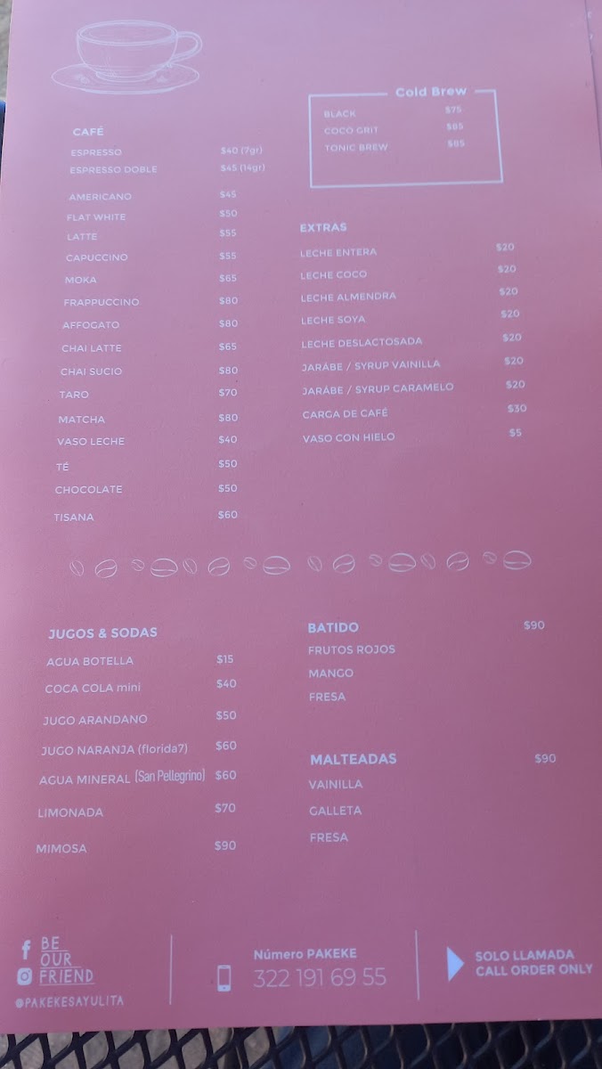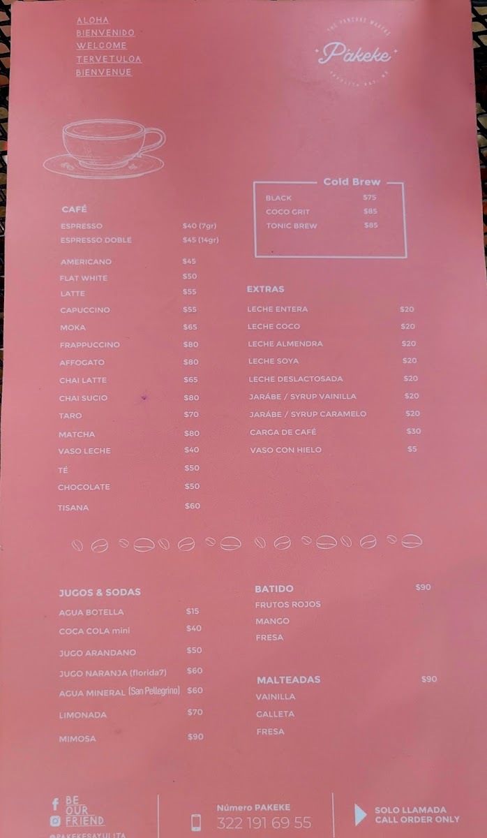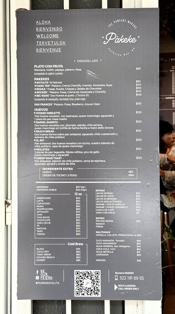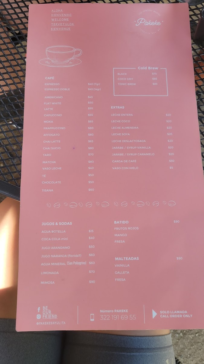 “ We did a snorkeling tour while on vacation and the shuttle picks you up at Pakeke. We grabbed lattes prior to heading out and realized that this was the first place in Sayulita that made the kind of latte we are used to having in our hometown. Their foam presentation even in a to go plastic cup was so neat. We decided to go back the next day for breakfast and are so glad that was the last meal we had in Sayulita before leaving for home. We got the molletes with an egg, burrito, spinach omelette with gluten free bread and we had to try one of the Pakeke’s. Everything was so good and fresh tasting. The food came out hot. The Pakeke we choose was thinner not quite thin as a crepe but it was so good it didn’t even need syrup. The molletes was delicious. I never thought about refried beans on a piece of toast with an egg but I am definitely going to make this at home. This place really does and outstanding job at presentation and taste. Also my daughter who is celiac said it was some of the best gluten free bread she has ever had. Quite a gem of a place. For 4 people, with drinks and food we paid about 1000 pesos. We also got a to go order as well so really it was 5 people eating. We found that this was consistently the cost to feed my family at the towns restaurants during our trip and didn’t seem unreasonable with the quality of the food. I mean I can’t feed this many people at a restaurant where I live in the states so for me the cost was worth what you got. When we come back to Sayulita we will definitely be coming back to Pakeke. ”